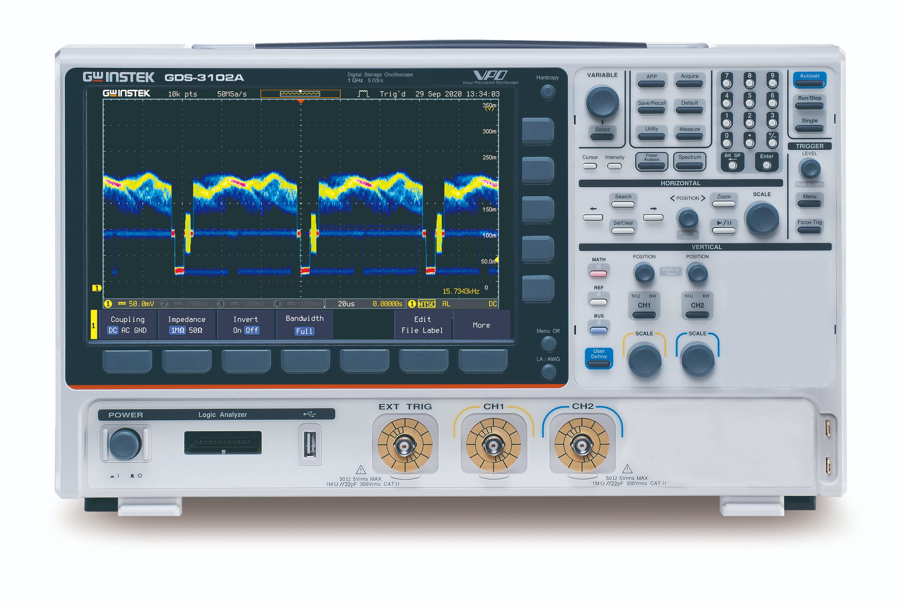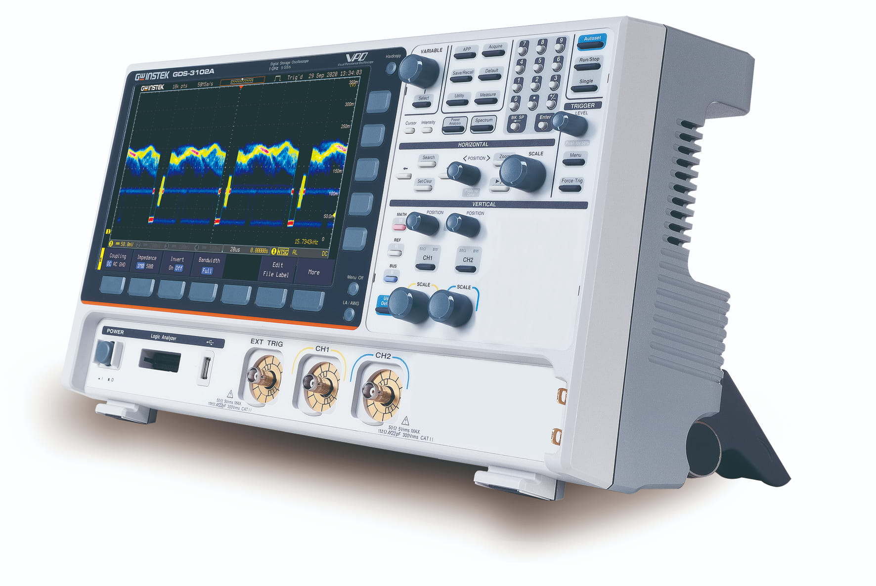 Equipped with two analog channels and deep per-channel memory of 200 Mpts, the GDS-3102A allows for extended waveform capture and detailed analysis without losing signal fidelity. A large 10.2" TFT LCD display provides clear visualization of time- and frequency-domain signals, while a high waveform update rate of up to 200,000 wfms/s ensures that elusive glitches and anomalies are reliably detected.