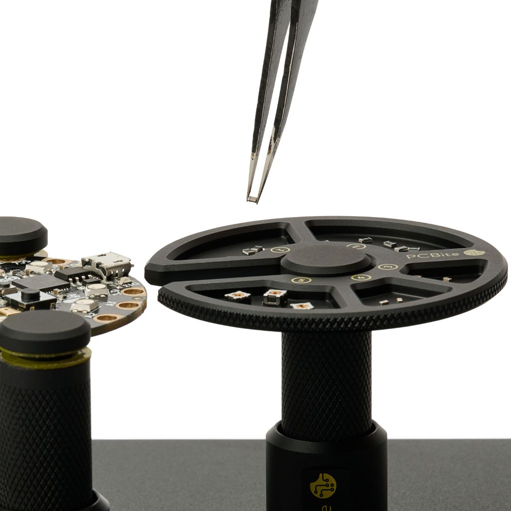 It fits both the original PCBite holder and the low-profile holder. Numbered compartments make planning easy, and when working under a microscope, components stay in focus, saving time and hassle.